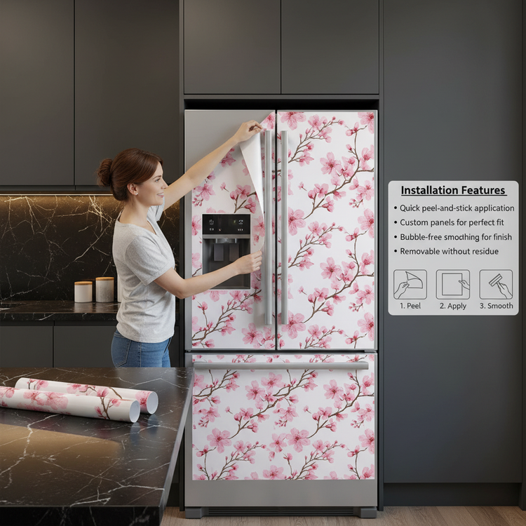 Our Fridge Wrap Floral Cherry Blossoms features tool-free peel-and-stick vinyl for an instant makeover, custom-sized panels to fit most standard fridges, and a protective layer that guards against scratches and smudges. The removable adhesive leaves zero residue upon removal, while air-bubble-free smoothing ensures a flawless finish. Delicate pink blossoms brighten your kitchen aesthetic, and the interchangeable design lets you update your décor anytime.