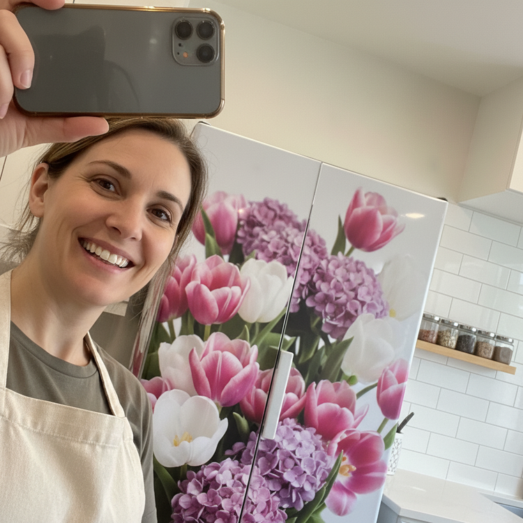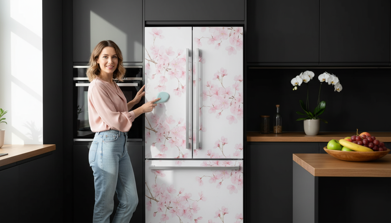 See how a simple peel-and-stick wrap can transform an ordinary fridge into a kitchen showpiece. These images highlight the flawless bubble-free finish and vibrant blossom design in real homes.